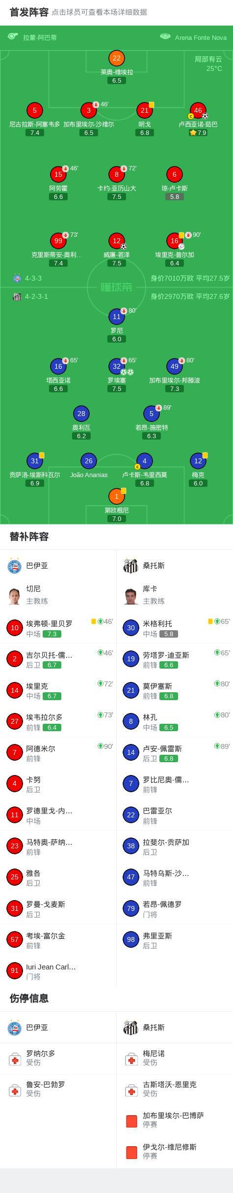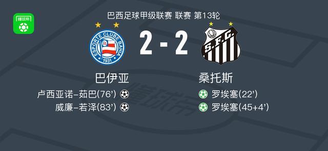 北京时间4月26日巴西足球甲级联赛 联赛 第13轮,巴伊亚主场对阵桑托斯。巴伊亚卢西亚诺-茹巴破门,威廉-若泽破门。桑托斯罗埃塞梅开二度。最终比分巴伊亚 2-2 桑托斯。
